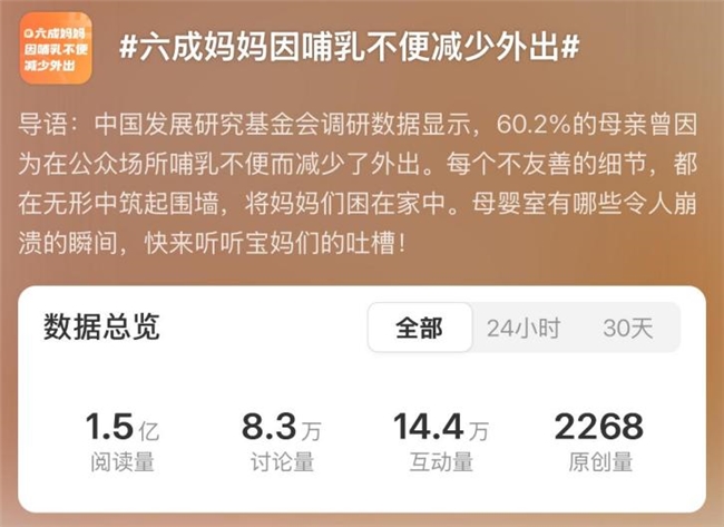 10月16日,#六成妈妈因哺乳不便减少外出#话题冲上热搜,引发社会热议,截至发稿,阅读量破1.5亿。知名演员蒋勤勤、郭碧婷、陈妍希,以及央视著名主持人月亮姐姐等众多明星联合《中国慈善家》杂志、浙江省妇女儿童基金会以及母婴头部品牌 Babycare共同发声呼吁:“关注母婴室公益、给母爱留个位子”。此外,多位奥运冠军、行业专家等社会知名人士都参与发声