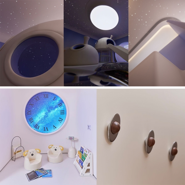 对用户痛点的洞察一直是Babycare设计的起点。郑州新郑国际机场母婴室,人性化设计的细节俯拾即是——为了防止宝宝碰撞受伤,全空间采用圆润边角,哺乳间更是整墙选用高铁优等座座椅同款柔软皮质;围绕孩子们喜爱的“太空旅程”主题,母婴室设计了星空顶、太空舷窗、还有太空飞行器造型的滑梯,甚至连挂衣钩都是飞碟的形状。