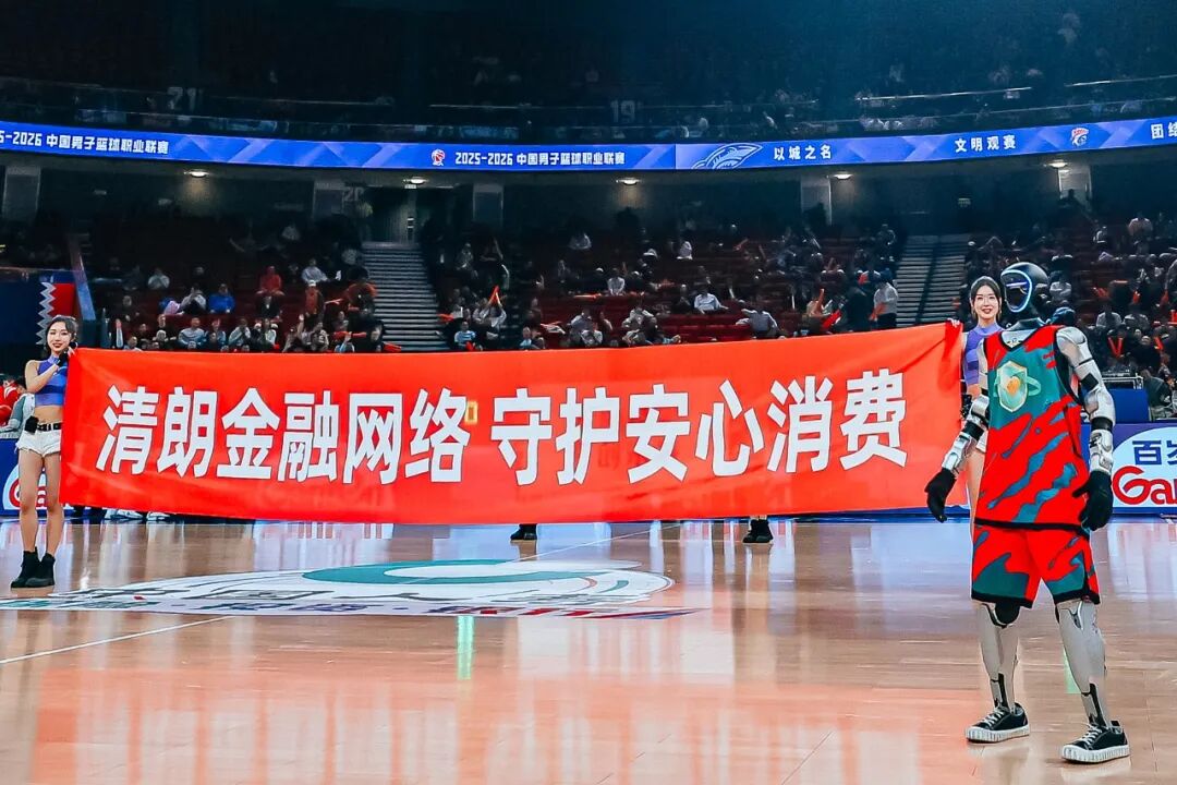 当晚的比赛场馆内,气氛热烈。第一节比赛节间,啦啦队闪亮登场,在球场中央展开“清朗金融网络 守护安心消费”的标语,格外醒目。广发银行机器人“发小宝”也亮相赛场,以科技感十足的机械舞动作引发观众阵阵欢呼。机器人背着印有消保口号“用心守护 放心托付”的定制帆布袋,向现场观众派发礼品,将金融科技与消保宣传完美融合,成为赛场上一道充满未来感的靓丽风景线。